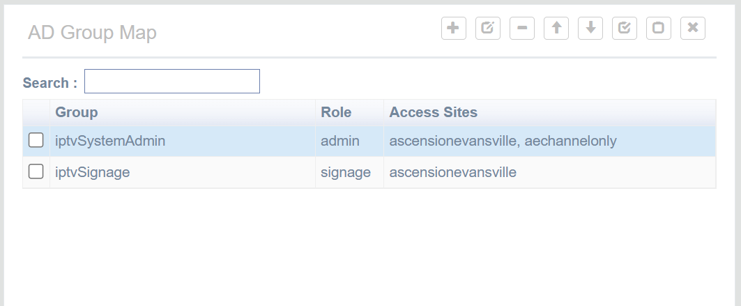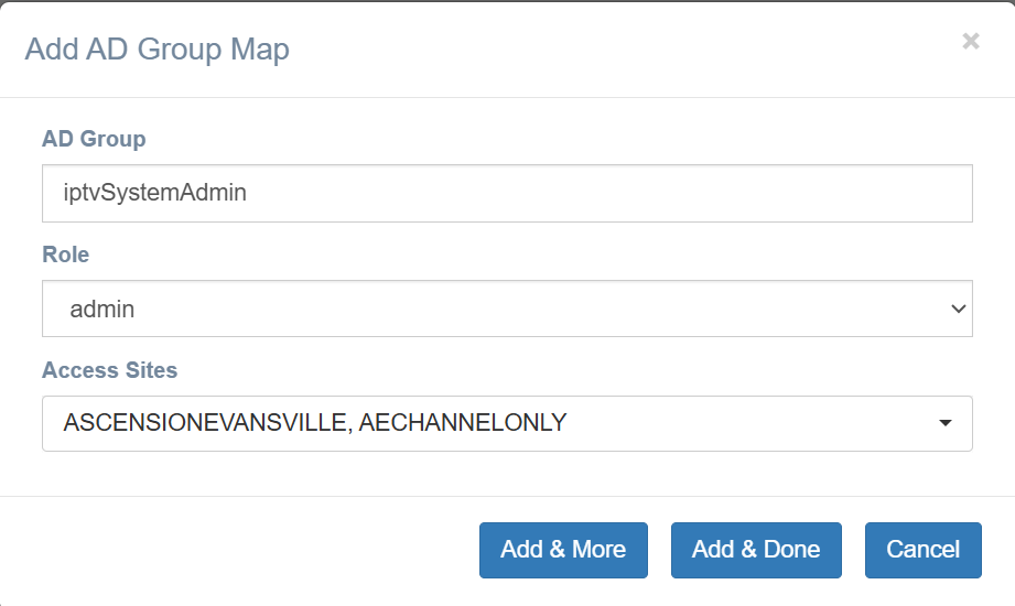 Create an “AD Group Map” in IPTV Console, where each “AD Group” defines a specific combination of “Role” and "Access Sites”.