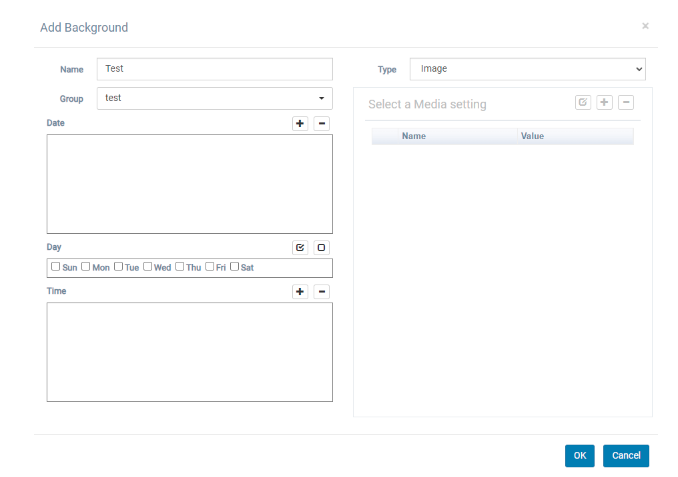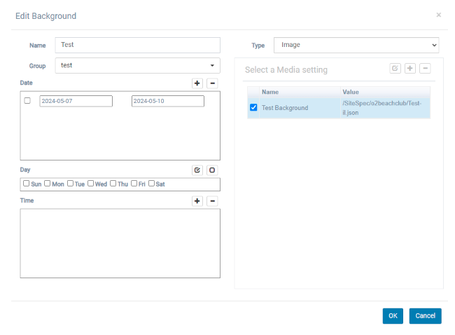 Under the Time section, leave blank if the background is to display all day, otherwise specify at which times the custom background should display.