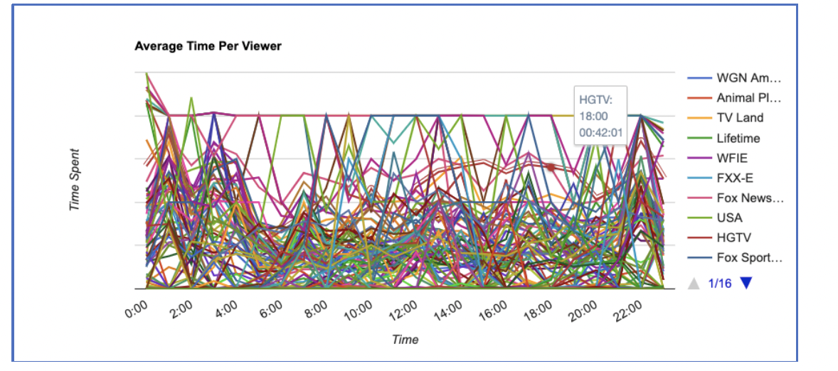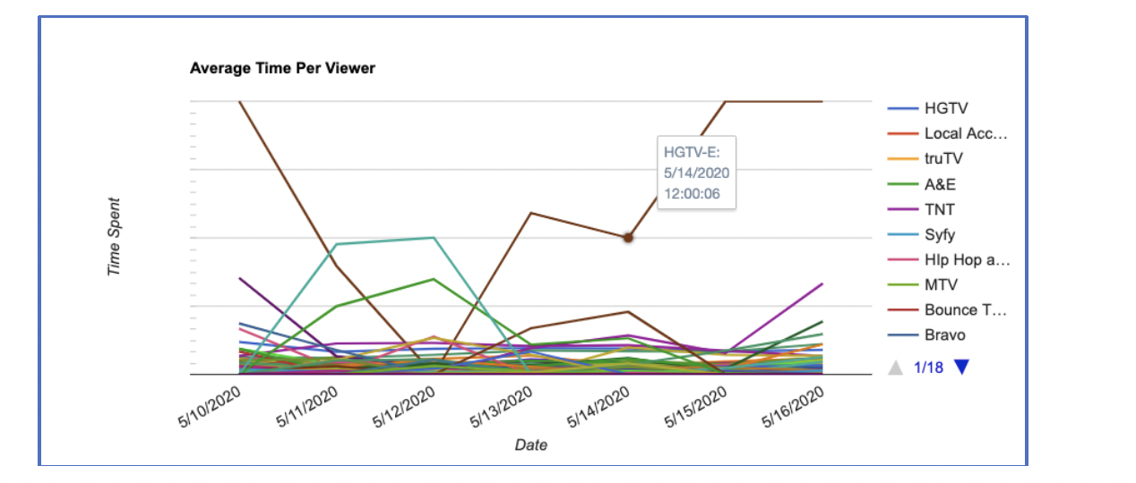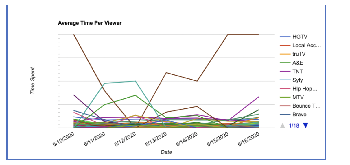 Charts also provide additional granularity. For example, the charts below associated with a weekly data table provides daily data. To see the data of a channel on a date, mouse over the point on the charts and see the information shown as the tooltip.