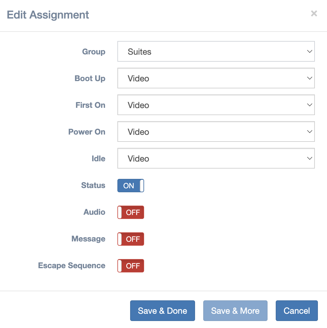 "Assignments": assignment of promotion content to groups of TVs and related operational configurations