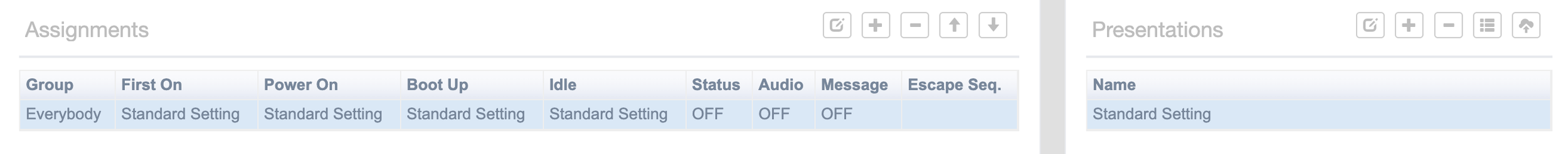 TP files can be created, edited and reviewed using "Promotion Console". In the example shown below TVs in the "Everybody" group is assigned to using the "Standard Setting" promotion content upon boot up, power on and idle, but the status of the assignment is presently off.