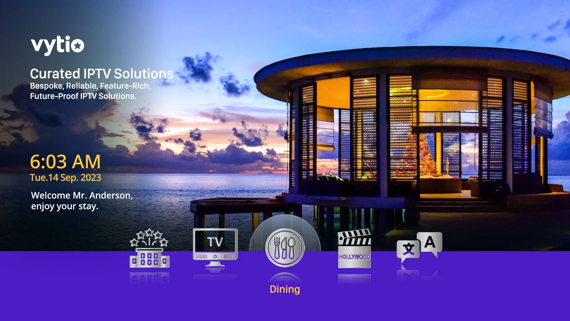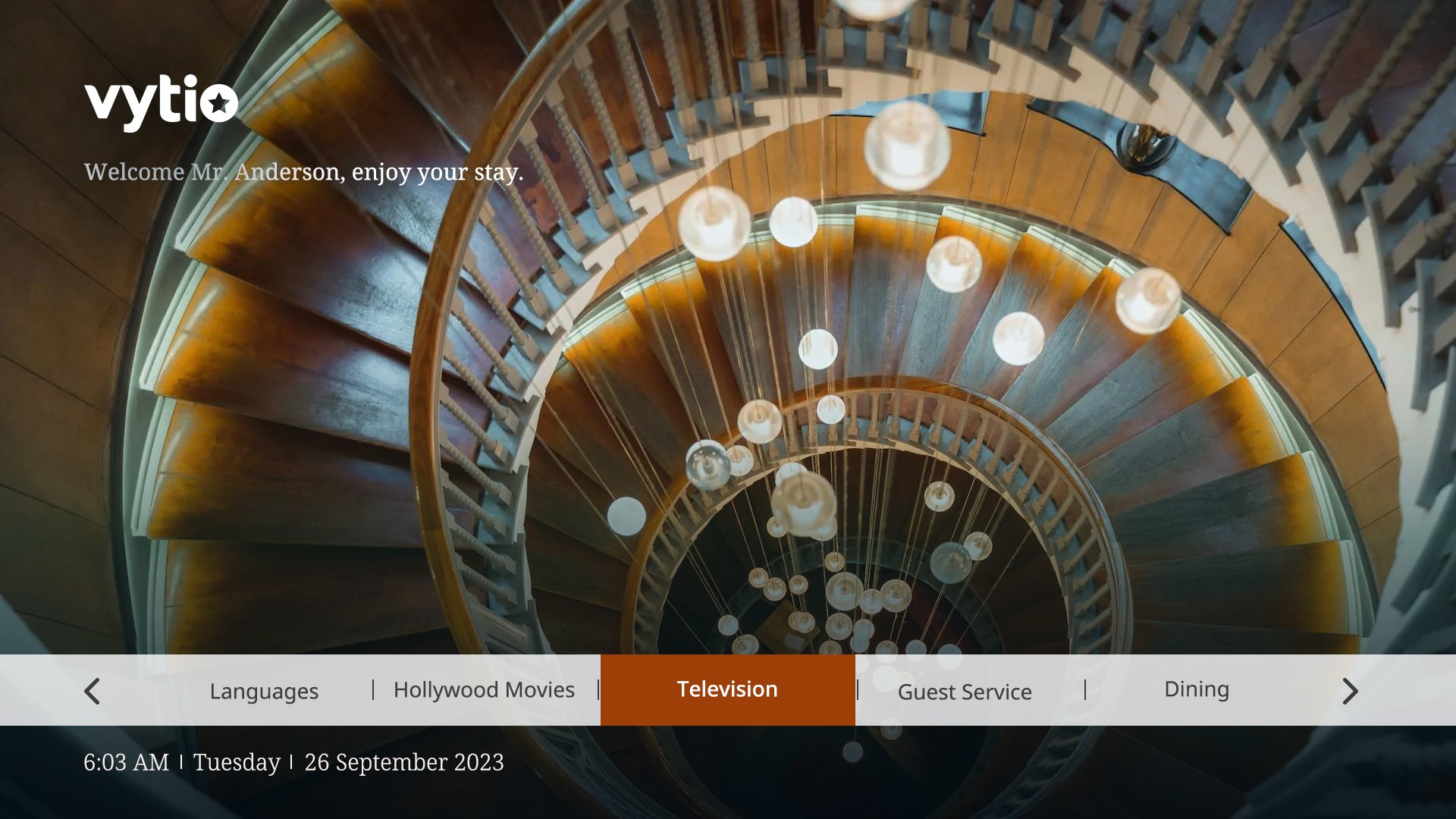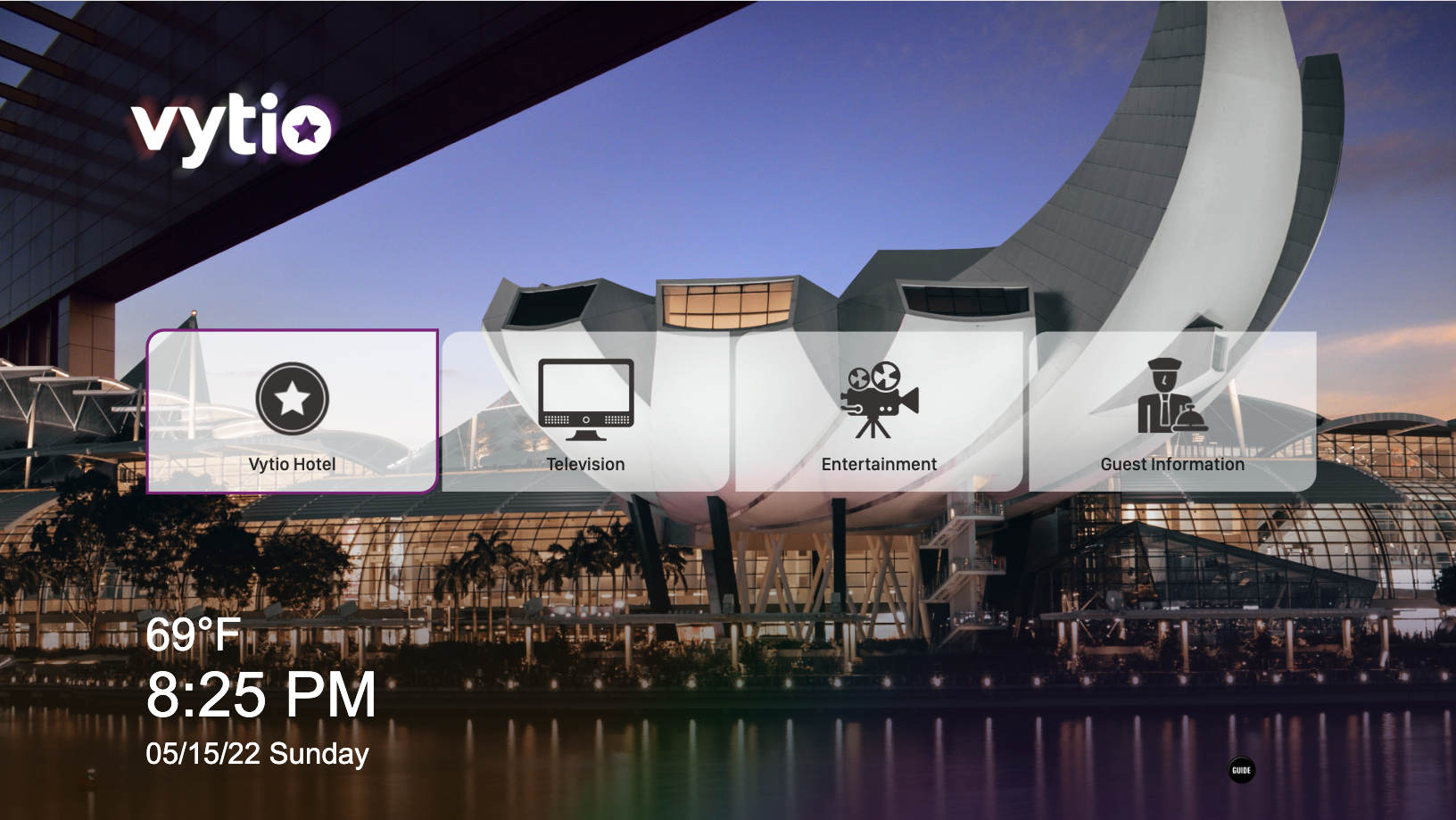 With Vytio for Hospitality the in-room television is no longer just a static display for guests to watch television channels. Vytio for Hospitality gives hoteliers the power to turn the television into a dynamic, communications and entertainment portal that is an extension of the hotel marketing and branding. We provide several different Graphical User Interface (GUI) styles/templates to choose from. Also note, that once a style is selected, if is by no means final. The Vytio for Hospitality platform gives customers the flexibility to easily change the TV GUI style.