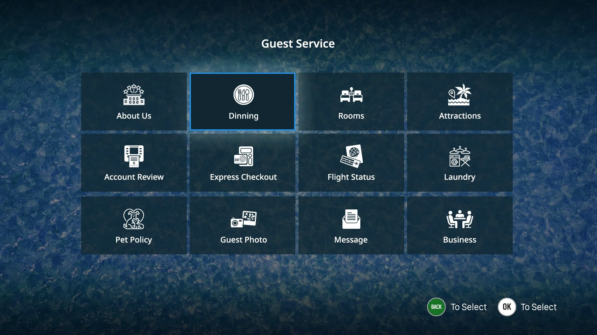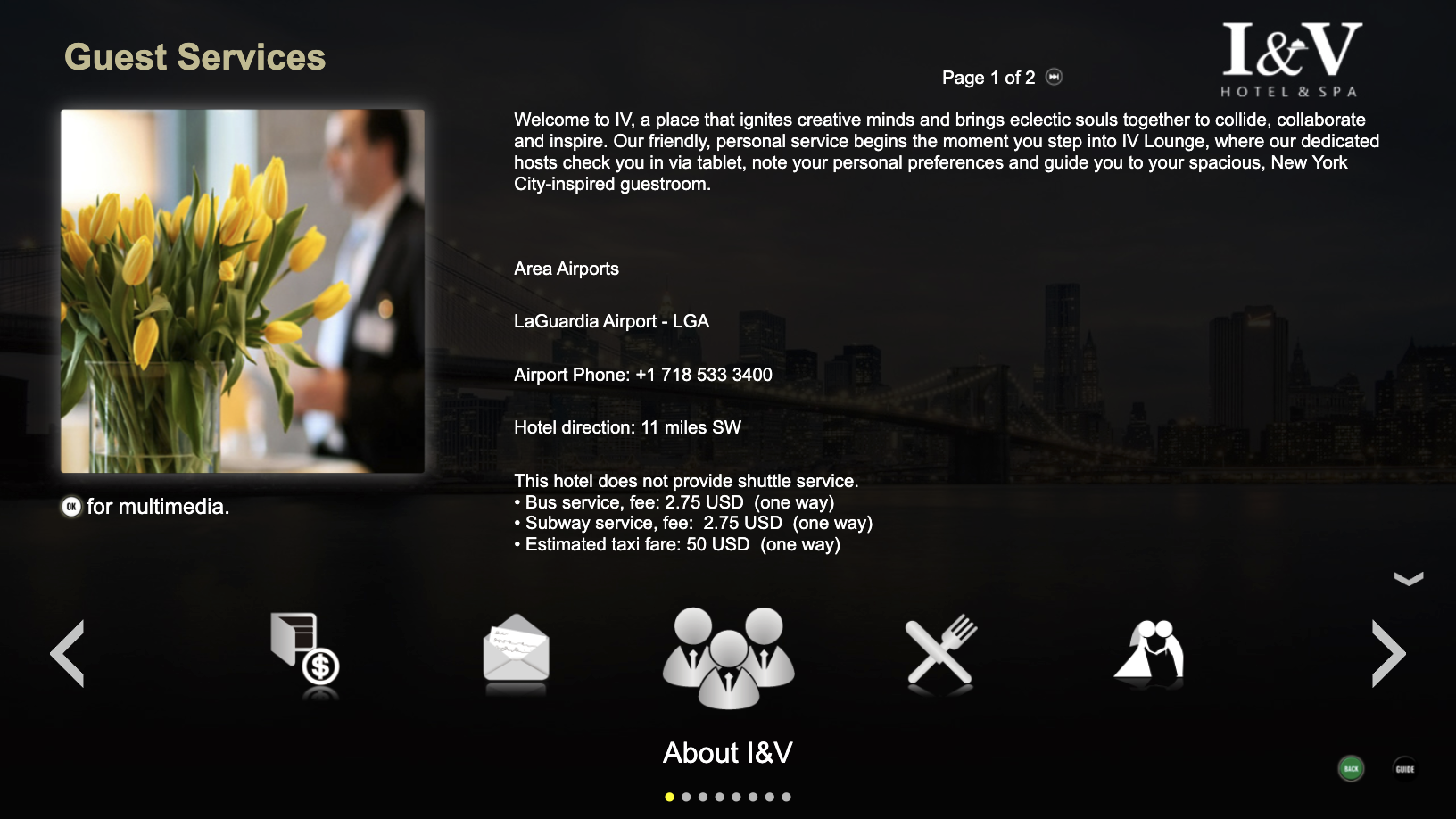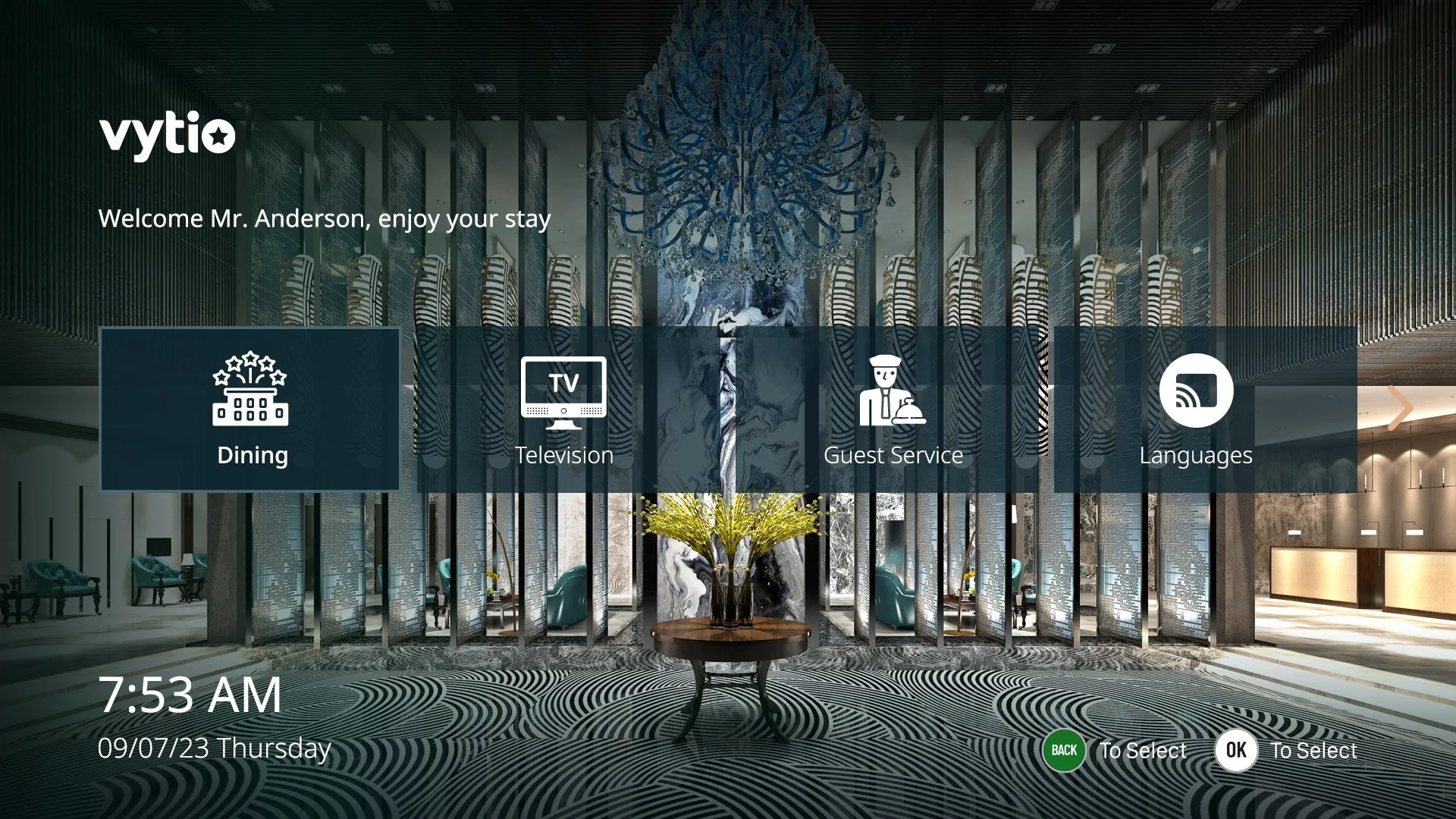 With Vytio for Hospitality the in-room television is no longer just a static display for guests to watch television channels. Vytio for Hospitality gives hoteliers the power to turn the television into a dynamic, communications and entertainment portal that is an extension of the hotel marketing and branding. We provide several different Graphical User Interface (GUI) styles/templates to choose from. Also note, that once a style is selected, if is by no means final. The Vytio for Hospitality platform gives customers the flexibility to easily change the TV GUI style.