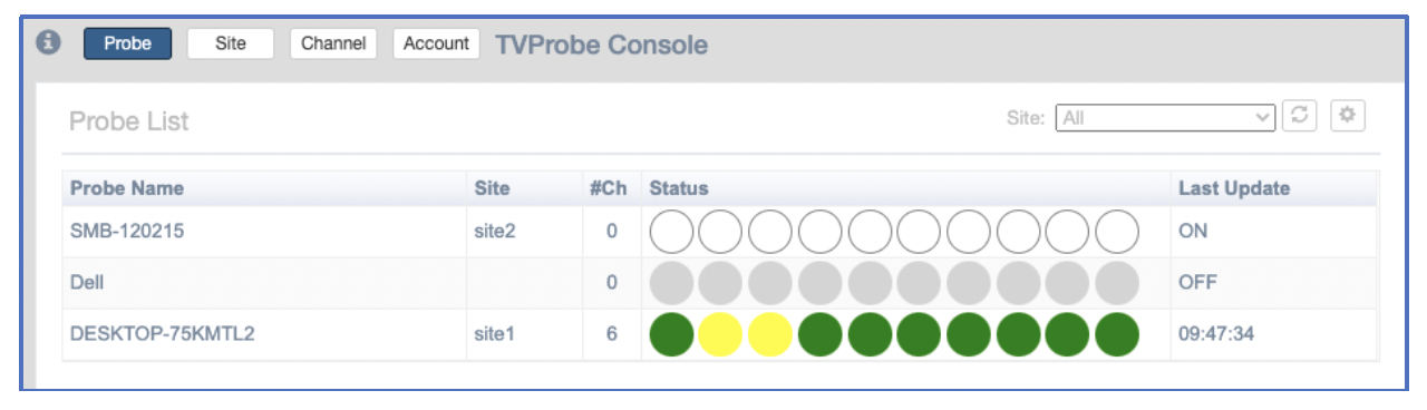 TVProbe SP Console is the user interface for using TVProbe SP. It has tabs for Probe, Site, Channel and Account, and an alert pane.